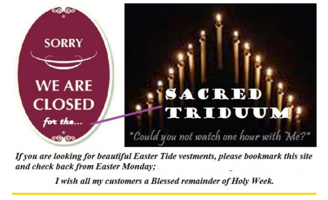 At Susan Maria Vestments, every design begins as an original work of prayer and precise reflection on what is required. This involves skill, and often many hours of hand craftsmanship. My artwork, including unique custom Bullion Embroideries/hand painted Vessicas and designs, patterns, and concepts are protected by Copyright and may not be copied, reproduced, adapted, or imitated without written permission. A company in Poland has made thousands of dollars through replicating one of my original designs for a detatchable Cope Hood, which I created in 2005-2006; and then also proceeded to pirate the fabric pattern of a British fabric firm.