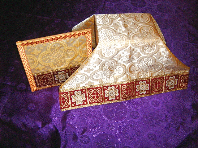 The fabric is a nice gold/white Church fabric. The entire set is lined in pure 100% silk. Imported British 3" Pugin banding found in the Chalice Veil, burse, Stole and Maniple. Gold/Red Quatrafoil 3/4" trimming on the Chasuble forms the Cross panels.