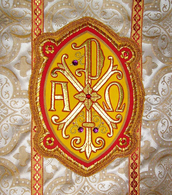 The Chasuble measures approximately 27" across the shoulders at back, and is 42" in length, measured from the base of the neckline curve. A unique 9" bullion emblem featuring the "CHI RHO" has been applied to the back of the Chasuble. You cannot buy this emblem anywhere else!