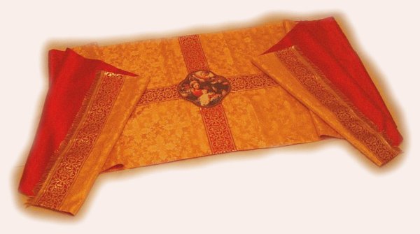 This special comprises a custom made Cope, Humeral Veil and Burse and Benediction Stole. Crafted in stunning gold church fabric with 3" red/gold orprhies, gold metallic 1" and 1/2" trims, 1" bullion fringing, red satin lining, ornate clasps, the set is completed with two different, tasteful images of the Holy Family, as shown, on the back of the Cope 'hood' and the Humeral Veil. The 10" square burse, lined in 100% pure linen, has a silk embroidery of the Holy Ghost. The Benediction Stole has bullion fringing and traditional tassel ties.