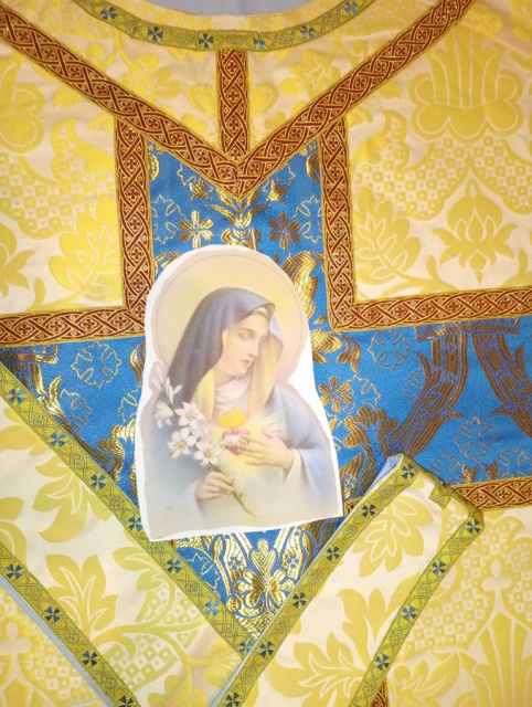 BELOW: Recently completed Marian Roman vestment set, in honor of the Immaculate Heart of Mary. Sewn in Cloth of Silver. Lined in pure silk Dupion and extensively trimmed as shown. Please inquire for the price, as the set below was created using stock on hand, and to replicate this again will need quoting.