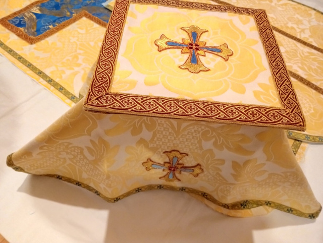 If you are interested in this design concept, please do not hesitate to contact me! The fabric is GoldWhite Saint Margaret, with banding and trimming in burgundy/gold. This fabric and trim is also highly suitable for a Eucharistic Processional Canopy, or Roman Vestments. The lining is pure silk.